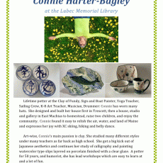 Lifetime potter at the Clay of Fundy, Sign and Boat Painter, Yoga Teacher, Sailing Crew, K-8 Art Teacher, Musician, Drummer: Connie has worn many hats.