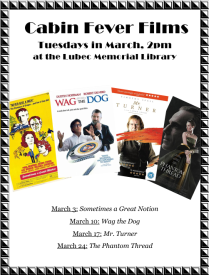 Tuesdays at 2pm. The last one for the season is on March 24th. The Lubec Memorial Library will show a different film weekly as part of our Cabin Fever Film series.