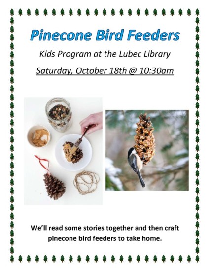 Join us Saturday morning October 18th, 10:30am for a kids program where we'll read stories together and then craft pinecone bird feeders to take home. Free and open to all.